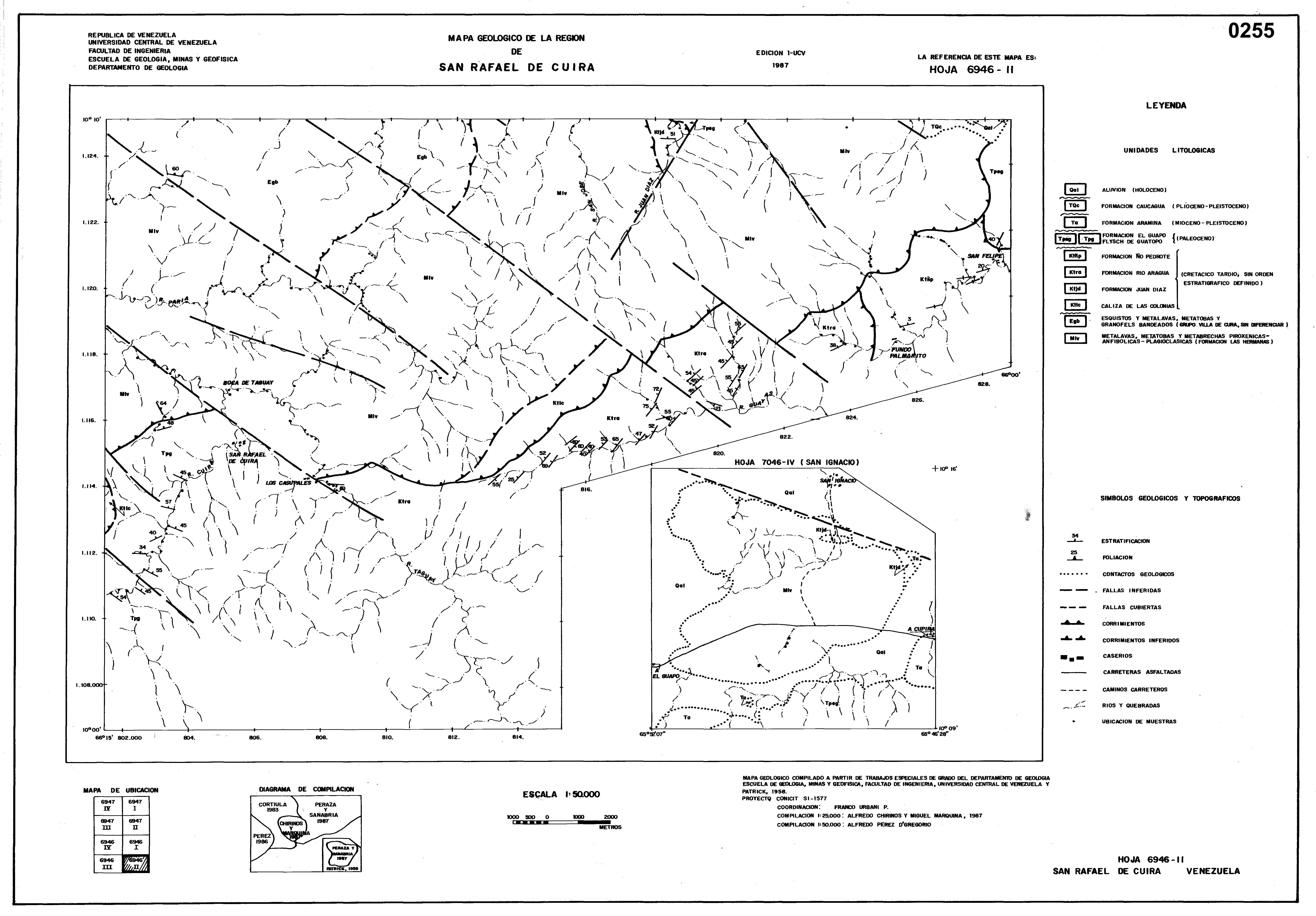 Observaciones: Mapa Geológico compilado a partir de trabajos especiales de grado del Departamento de Geología de la Escuela de Gelogía, Minas y Geofísica,Facultad de Ingeniería, Universidad Central de Venezuela