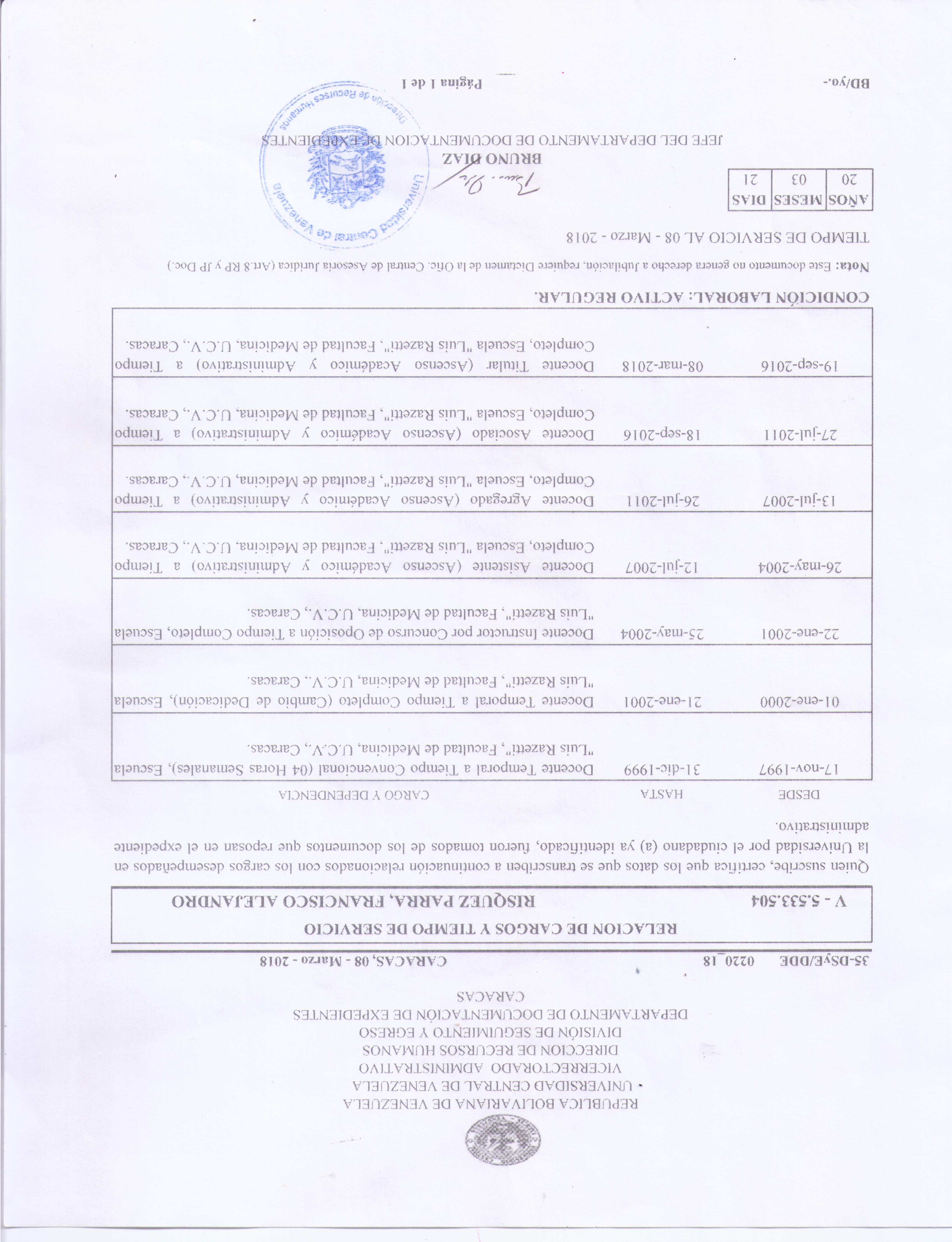 | Title: | relacion de cargos y tiempo de servicio UCV A. Risquez 2018 |