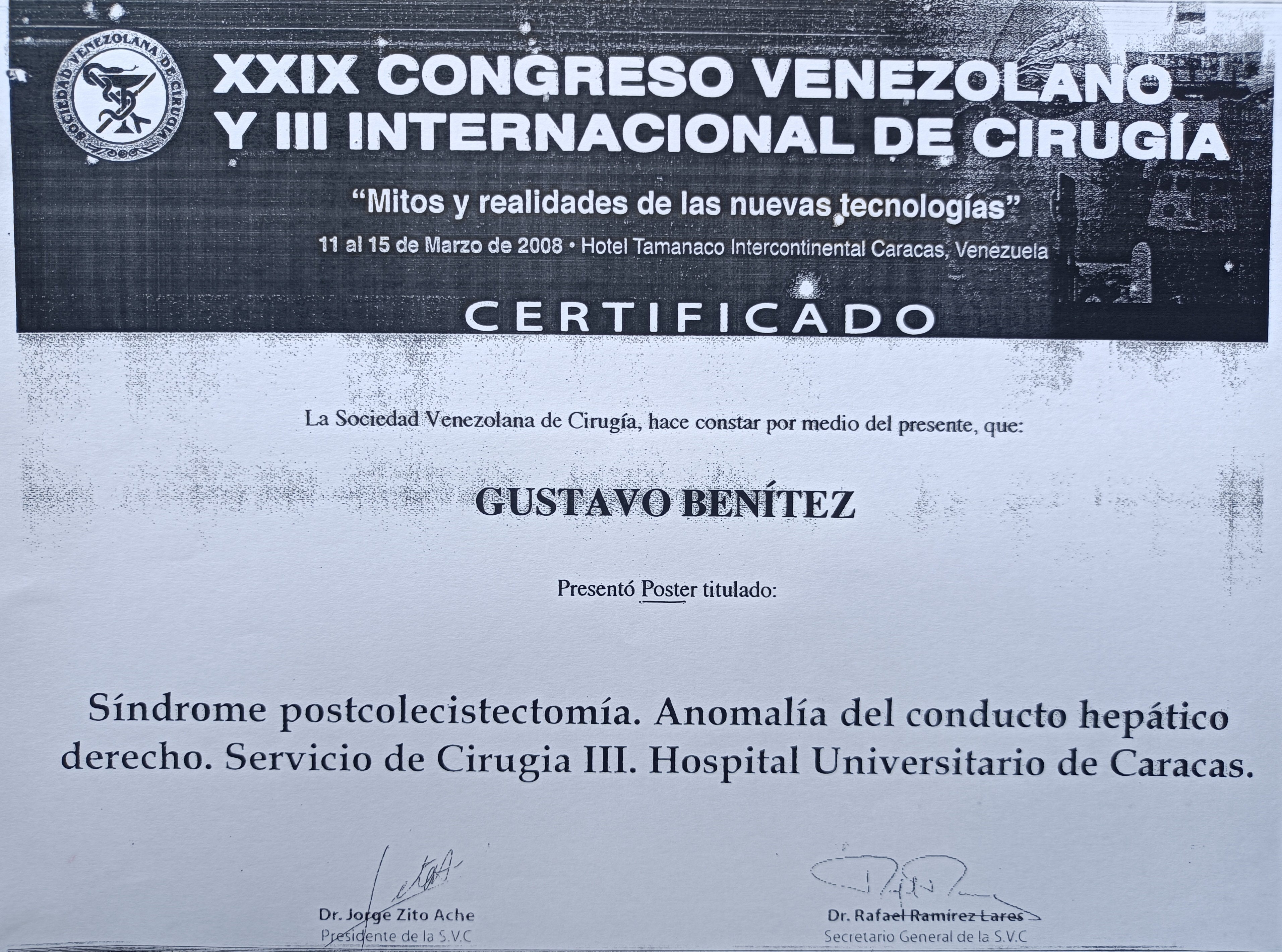 | Series/Report no.: | XXIX Congreso Venezolano y III Internacional de Cirugía “Mitos y realidades de las nuevas tecnologías”.;11 al 15/03/2008 |