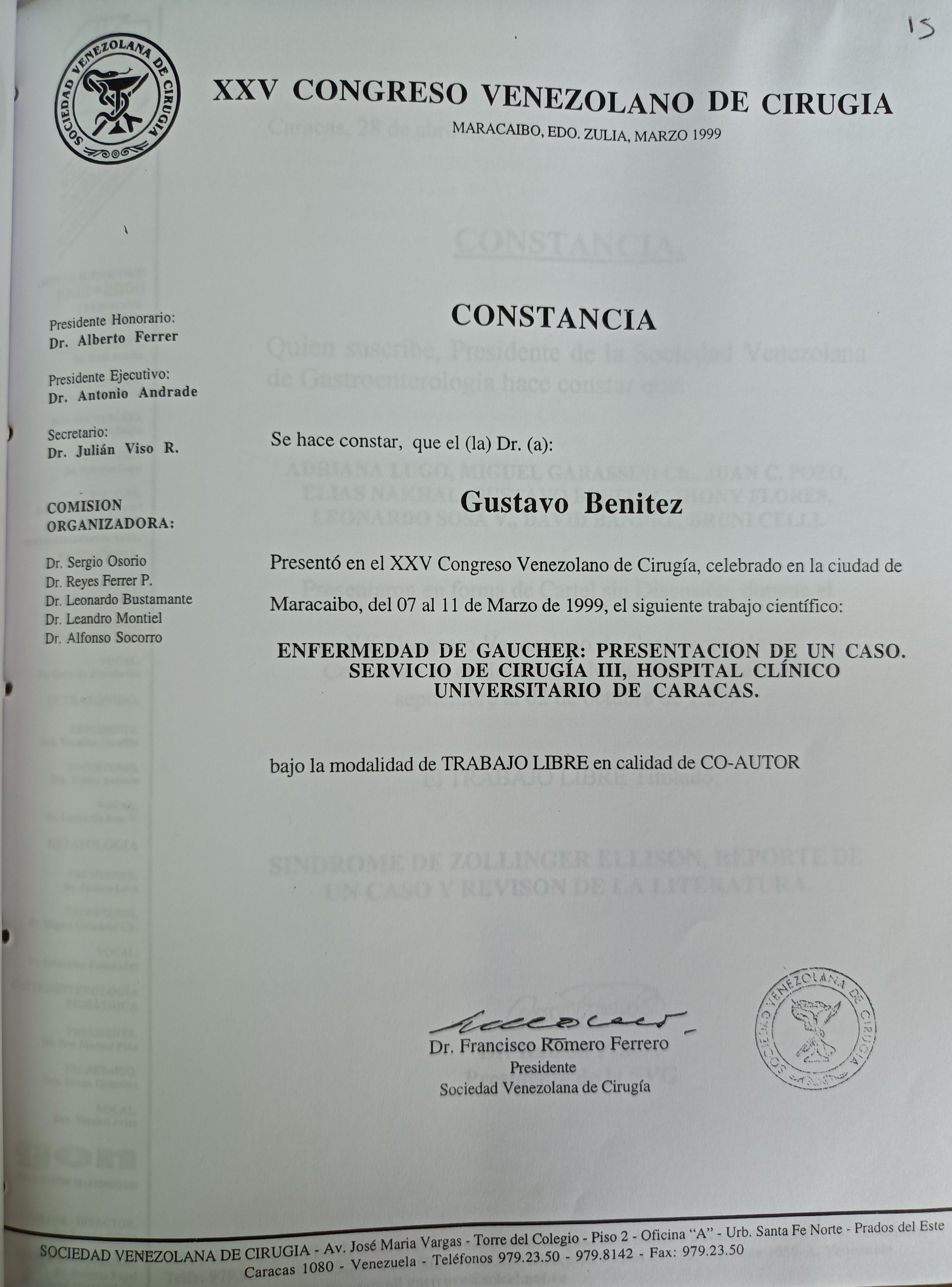 | Title: | Enfermedad de Gaucher: presentación de un caso. Servicio de Cirugía III, Hospital Clínico Universitario de Caracas. (Presentación en Congreso) |