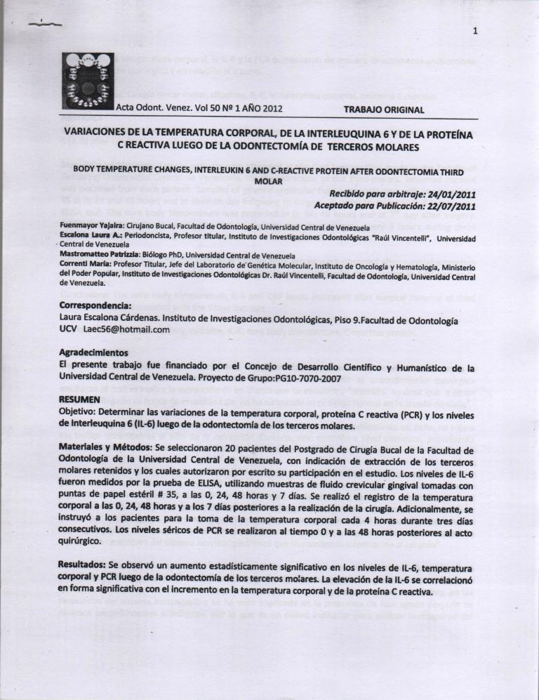 Materiales y Métodos: Se seleccionaron 20 pacientes del Postgrado de Cirugía Bucal de la Facultad de Odontología de la Universidad Central de Venezuela, con indicación de extracción de los terceros molares retenidos y los cuales autorizaron por escrito su participación en el estudio. Los niveles de IL-6 fueron medidos por la prueba de ELISA, utilizando muestras de fluido crevicular gingival tomadas con puntas de papel estéril # 35, a las 0, 24, 48 horas y 7 días. Se realizó el registro de la temperatura corporal a las 0, 24, 48 horas y a los 7 días posteriores a la realización de la cirugía. Adicionalmente, se instruyó a los pacientes para la toma de la temperatura corporal cada 4 horas durante tres días consecutivos. Los niveles séricos de PCR se realizaron al tiempo 0 y a las 48 horas posteriores al acto quirúrgico.