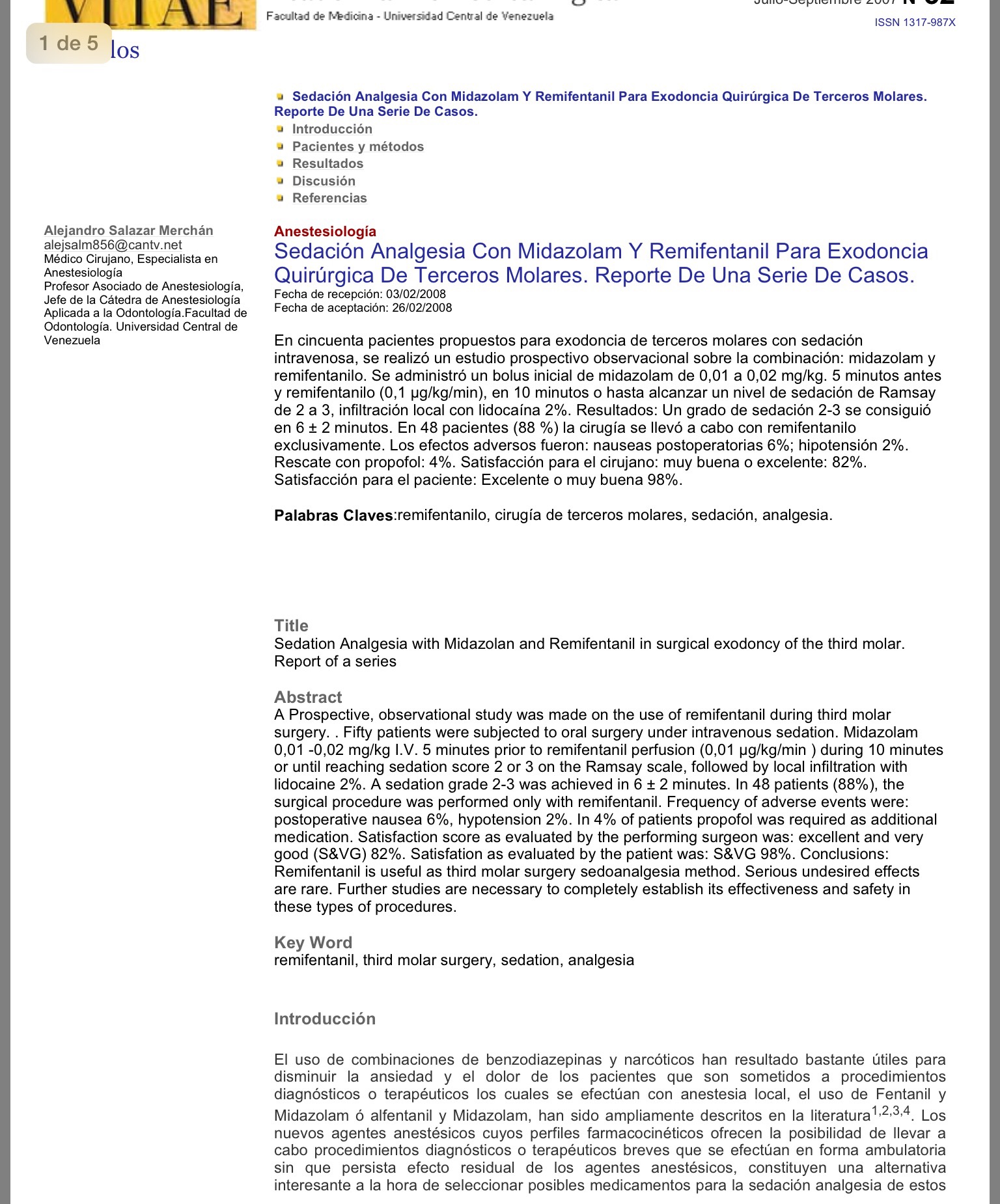 | Title: | Sedación Analgesia Con Midazolam Y Remifentanil Para Exodoncia Quirúrgica De Terceros Molares. Reporte De Una Serie De Casos. |