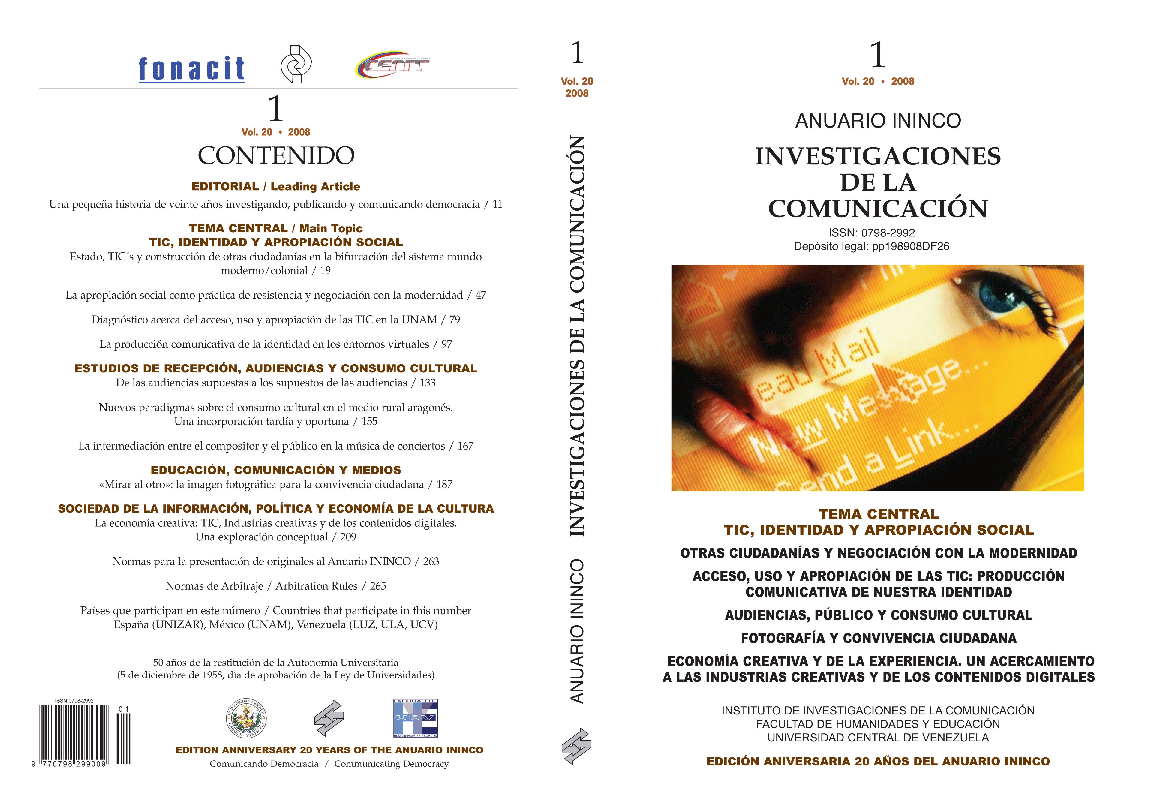 Anuario ININCO / Investigaciones de la Comunicación. VOL20 N°1 2008. Texto completo para colección.