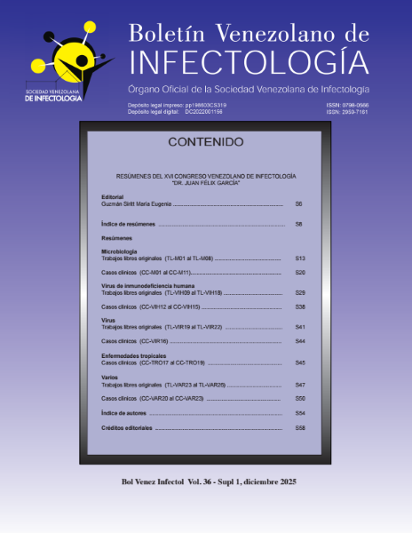 El suplemento del Boletín Venezolano de Infectología (BVI) tiene como finalidad difundir y preservar las experiencias clínicas e investigaciones académicas compartidas durante el XVI Congreso Venezolano de Infectología “Dr. Juan Félix García”, efectuado en Caracas, Venezuela, entre el 26 y el 28 de junio de 2025. La compilación reúne diversos enfoques, investigaciones originales y casos clínicos inéditos relacionados con diagnóstico, presentaciones clínicas y tratamientos de enfermedades infecciosas. Incluye además tópicos sobre control de infecciones, higiene de manos y formación curricular en la especialidad.