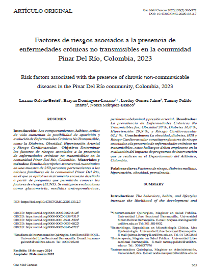 Galván-Bertel, L., Domínguez-Lozano, B. ., Gómez Jaime, L. ., Pulido Iriarte, T. ., & Márquez-Blanco, N. . (2025). Factores de riesgos asociados a la presencia de enfermedades crónicas no transmisibles en la comunidad Pinar Del Río, Colombia, 2023: Risk factors associated with the presence of chronic non-communicable diseases in the Pinar Del Río community, Colombia, 2023. Gaceta Médica De Caracas, 133(2), 365–372. Recuperado a partir de https://saber.ucv.ve/ojs/index.php/rev_gmc/article/view/30969