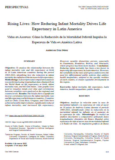 Díaz-Pérez, A. . (2025). Rising Lives: How Reducing Infant Mortality Drives Life Expectancy in Latin America: Vidas en Ascenso: Cómo la Reducción de la Mortalidad Infantil Impulsa la Esperanza de Vida en América Latina. Gaceta Médica De Caracas, 133(2), 613–620. Recuperado a partir de https://saber.ucv.ve/ojs/index.php/rev_gmc/article/view/30995